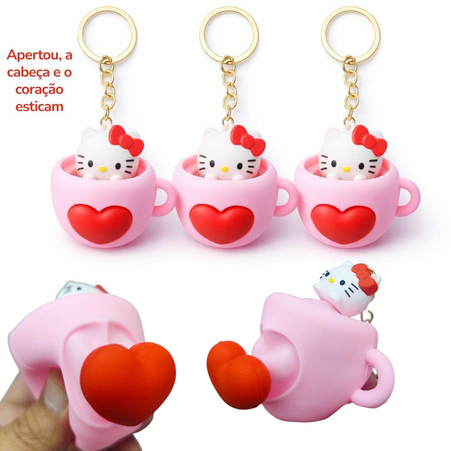 Um chaveiro divertido e fofo que traz a personagem Hello Kitty dentro de uma xícara rosa com coração vermelho. Ideal para ajudar a organizar suas chaves com estilo e originalidade.