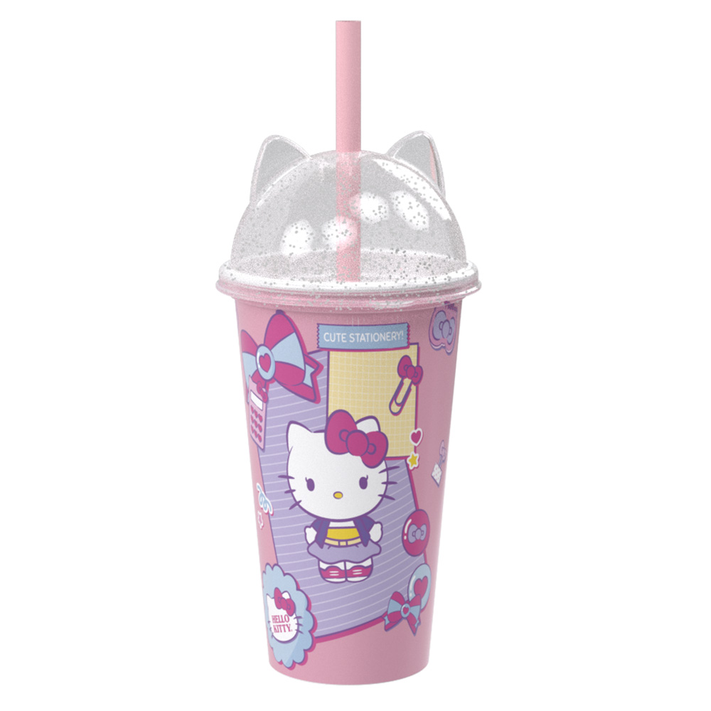 Design com Brilho: A grande estrela deste copo é a tampa lúdica com as orelhinhas 3D da Hello Kitty, agora repleta de glitter injetado, trazendo um visual mágico e diferenciado.